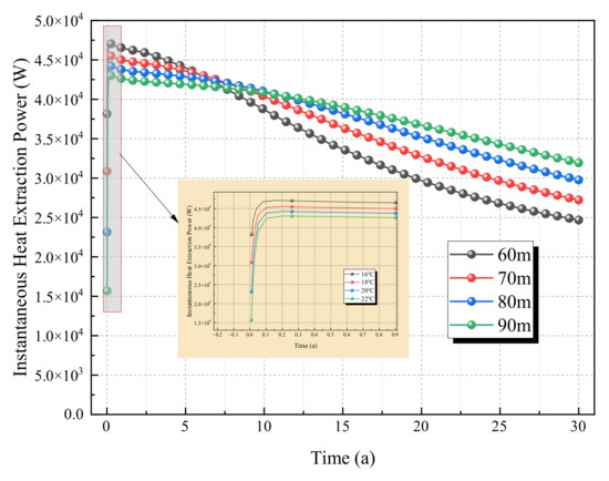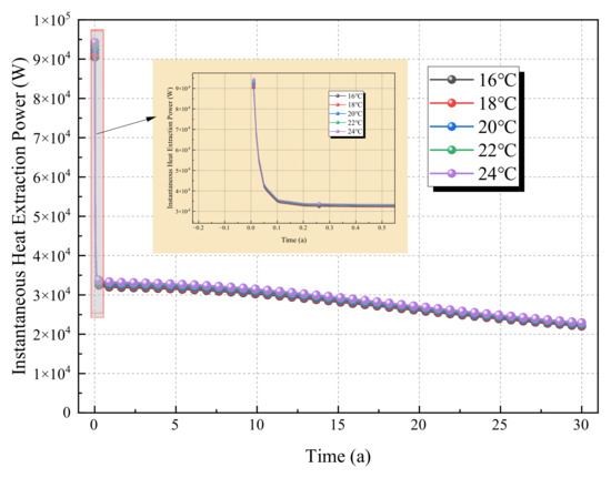 The initial heat extraction power is high, followed by continuous attenuation. The overlapping curves show that within the 16–24 °C range, the influence of injection temperature on the dynamic evolution of instantaneous heat production intensity is consistent. In the early extraction stage, the strong temperature difference drives rapid fluid seepage, and the thermal convection efficiency reaches a relatively high level; the marginal impact of minor changes in injection temperature (16–24 °C) on the “seepage–thermal convection” coupling process is negligible. Therefore, the initial peak value and attenuation trend of instantaneous power both show overlap.