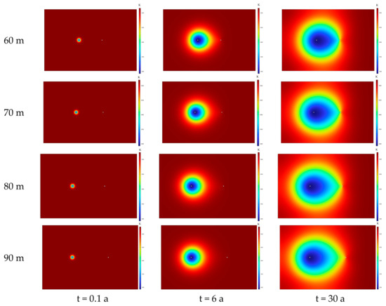 - Late extraction stage (t = 30 a): The cold zone at a well spacing of 60 m almost penetrates the entire area between the injection and production wells, while the cold zone range at 90 m is relatively small. This shows that smaller well spacing leads to faster reservoir heat consumption and a more rapid thermal depletion process.