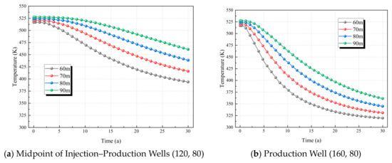 Well spacing is a key parameter affecting the fluid flow path and heat exchange efficiency between injection and production wells. In this study, a well spacing of 80 m was selected as the baseline case for the majority of the simulations presented in this work (e.g., the analysis of reservoir evolution in Section 4.1 and the investigation of injection temperature in Section 4.3). This baseline value was chosen as a representative spacing found in many engineered geothermal systems, providing a common reference for comparing the effects of other parameters.