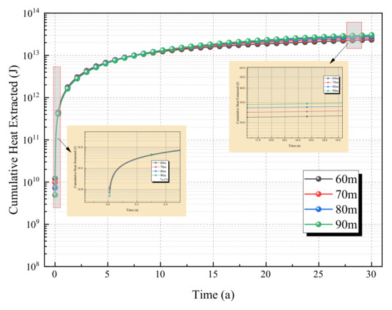 The cumulative heat extraction continuously increases over time and gradually approaches saturation. The final cumulative amount at large well spacing (90 m) is significantly higher than that at small well spacing (60 m). For example, after 30 years, the cumulative heat extraction at 90 m is close to 2.97 × 1013 J, while it is approximately 2.21 × 1013 J at 60 m. Growth rate: In the early stage (0–5 years, enlarged view), the cumulative amount at small well spacing increases extremely rapidly, while the growth at large well spacing is relatively slow. In the later stage (10–30 years), the growth of the cumulative amount at small well spacing tends to stagnate (due to thermal depletion), while large well spacing still maintains stable growth and eventually surpasses the cumulative amount at small well spacing. Mechanism: The high instantaneous power at small well spacing drives the rapid rise of cumulative amount in the early stage; however, the reservoir heat is quickly exhausted, leading to stagnant growth in the later stage; large well spacing results in slow reservoir heat consumption, sustainable long-term growth, and ultimately higher total gain.