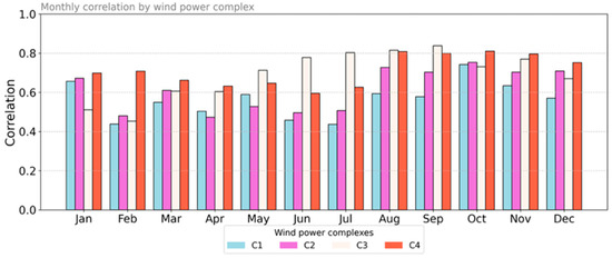 Monthly correlation between the observed wind speed (AMT) and wind speed predicted by the WRF model, based on 30 min average data throughout the year 2020. Grouped bars represent different wind power complexes. Each group of bars corresponds to a month, and bar height indicates the Pearson correlation coefficient (r), constrained to the [0, 1] interval. Higher values reflect greater agreement between the model predictions and observations.
