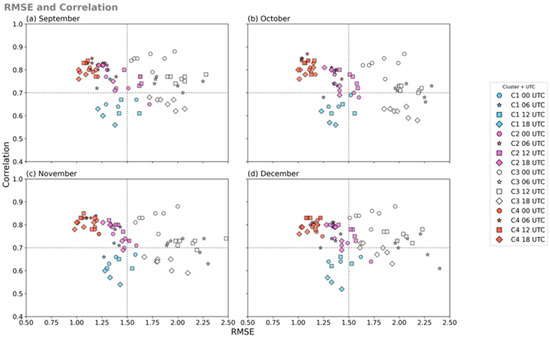 Scatterplot between the root mean square error (RMSE) and correlation for the observed and simulated data by tower from September to December. Each subplot (a–d) represents one month and includes results for four daily time steps: 00 UTC (circle), 06 UTC (star), 12 UTC (square), and 18 UTC (diamond). Colors indicate tower clusters based on location: C1 (light blue), C2 (purple), C3 (light gray), and C4 (red).