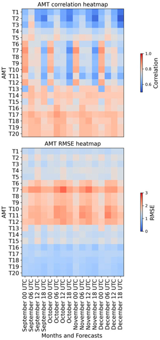 Heatmap of correlation (top) and RMSE (bottom) for forecast runs and operational months of the WRF model.