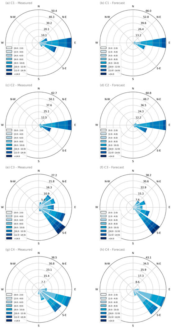 Wind rose diagrams for the observed and modeled wind data from four meteorological tower complexes (C1 to C4), covering the period from September to December 2020. Subfigures (a,c,e,g) correspond to the observed data (AMT), while (b,d,f,h) show the wind forecasts produced by the WRF model. The wind roses were generated using 30 min interval data, considering wind speeds between 0 and 30 m/s and directions from 0° to 360°, with outliers removed. Each row in the matrix represents a distinct complex, enabling direct comparison between the angular distribution of the observed and modeled winds.