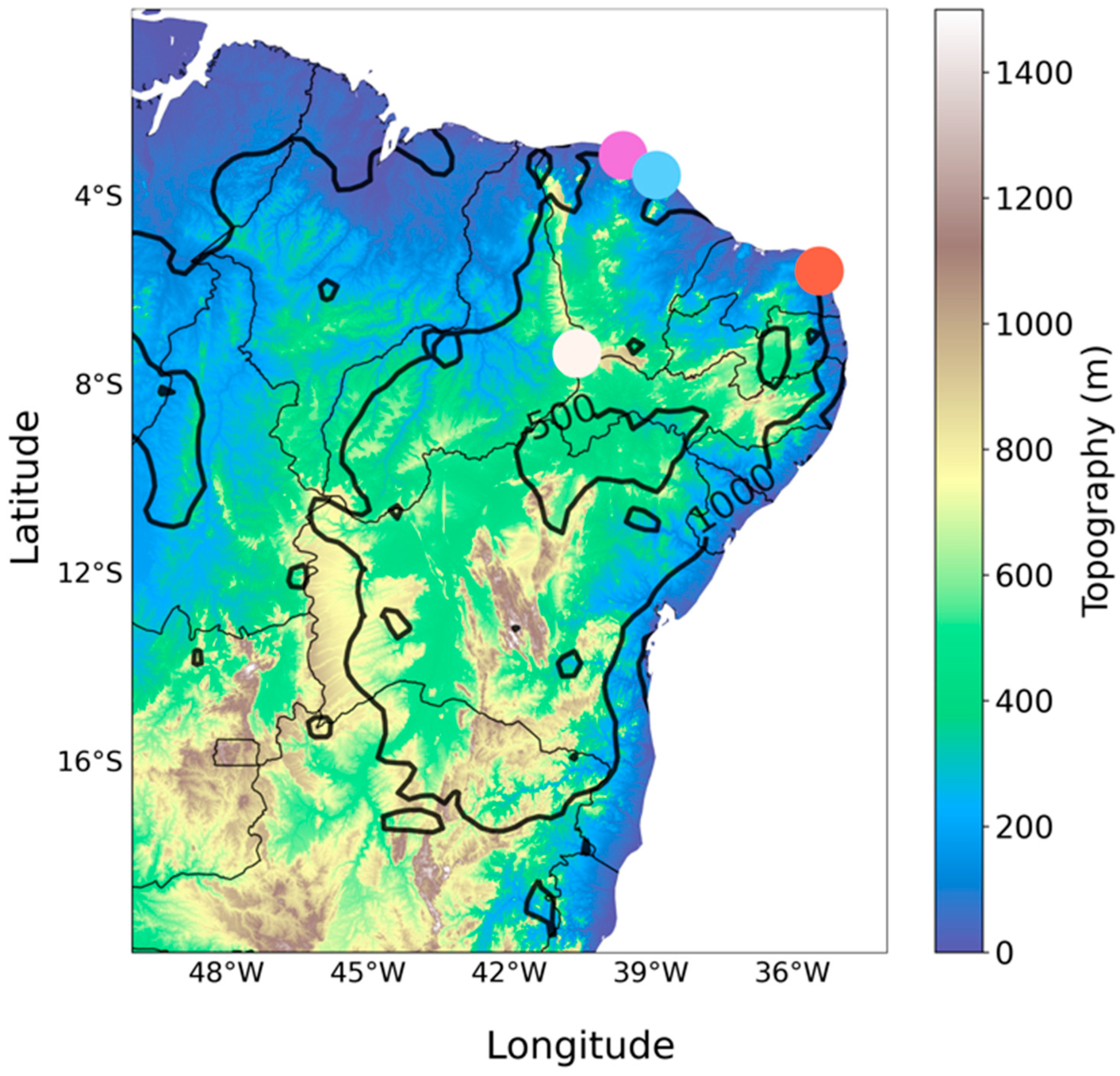 - Correia Filho, W.L.F.; De Oliveira-Júnior, J.F.; De Barros Santiago, D.; De Bodas Terassi, P.M.; Teodoro, P.E.; De Gois, G.; Blanco, C.J.C.; De Almeida Souza, P.H.; da Silva Costa, M.; Gomes, H.B.; et al. Rainfall Variability in the Brazilian Northeast Biomes and Their Interactions with Meteorological Systems and ENSO via CHELSA Product. Big Earth Data 2019, 3, 315–337. [Google Scholar] [CrossRef]