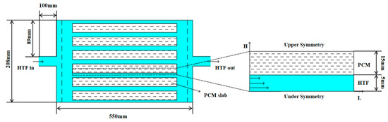 In order to explore the internal structure of the flat-panel phase-change energy storage device and the influence on the energy storage/release performance of the different operating conditions of the device, the flat-panel phase-change energy storage device was designed, as illustrated in Figure 1. The unit is composed of a rectangular water tank and horizontally placed PCM plates that are stacked and maintained at a certain gap to act as a heat exchange runner for water. A diffuser is provided at the inlet and outlet of the unit to ensure that the water flow is evenly distributed to the various heat exchange runners.