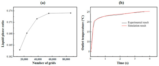 In order to verify the independence of the grid, it is necessary to select as few grid numbers as possible under the premise of ensuring the calculation accuracy, so as to improve the calculation speed. In this study, the grid independence of the model with an HTF channel of 10 mm and a PCM cell size of 500 × 250 × 30 mm3 is verified. When the grid number is 14,000, 24,012, 38,316, 55,000 and 86,250, the cold release process of the phase-change energy storage unit is numerically simulated, and the change curve of the PCM liquid-phase ratio at 4000 s is obtained, as illustrated in Figure 3a. When the number of grids is 55,000 and 86,250, the liquid-phase ratio is nearly identical. Hence, to save computational resources, it is feasible to select 55,000 grids for the computation.