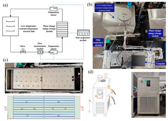 Experimental research system of storage/release operation performance of a flat-panel thermal energy storage device based on phase change: (a) system schematic diagram; (b) physical drawings of the experimental system; (c) interior view and distribution of temperature measurement points of flat-panel thermal energy storage device based on phase change; (d) low-temperature and constant-temperature reaction bath model and physical drawings.