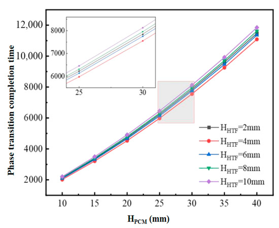 Figure 5 shows the completion time of the phase change in the PCM of the flat-plate phase-change cold storage unit with different structural dimensions under the cooling condition of inlet temperature of 2 °C and flow rate of 0.05 m/s. The results show that the completion time of the phase-change cold storage unit increases with the increase in the thickness of HPCM when the flow channel gap HHTF is kept constant. The results show that, when the flow channel gap HHTF is kept constant, the completion time of the phase-change cold storage increases with the increase in the thickness of HPCM, and the increase gradually increases. On the other hand, when the HPCM is kept constant, the phase-change completion time decreases and then increases with the increase in the runner gap HHTF.