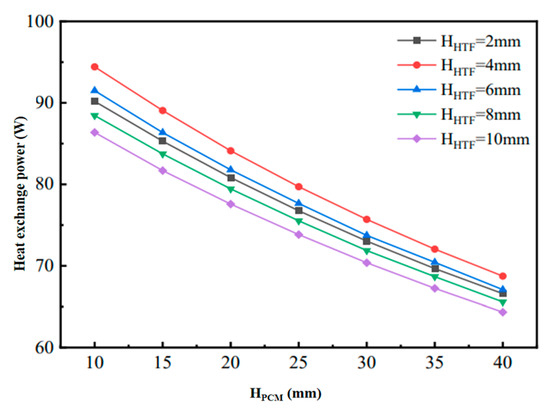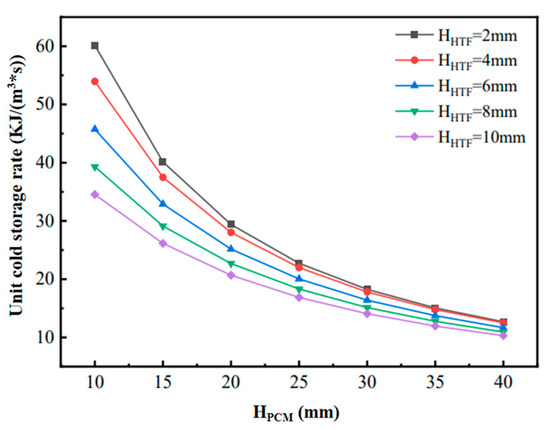 Figure 6 shows the changes in heat transfer power during the cooling process of phase-change units with different structural dimensions. When the flow channel gap HHTF is kept constant, although increasing HPCM increases the cooling capacity, the increase in the completion time of the phase-change cooling is larger, which results in the decreasing in the final phase-change heat transfer power, but the decreasing amplitude of the decrease is gradually reduced. Therefore, when the HHTF is constant, a larger HPCM can be chosen in order to ensure a higher density of cold storage; on the other hand, when the HPCM remains constant, the heat transfer power of the flat-plate phase-change thermal energy storage unit increases and then decreases with the increase in the HHTF. Figure 7 shows the variation in the unit cooling rate of the phase-change units with different structural dimensions, reflecting the average cooling rate per unit volume of flat-plate phase-change units with different phase-change energy storage densities formed under different combinations of HPCM and HHTF. The figure shows that the unit cooling rate of the phase-change cooling storage unit decreases with the increase in HHTF and decreases with the increase in HPCM. This is mainly because, when HPCM is kept constant, the cold storage capacity of the phase-change refrigeration unit remains unchanged, but the increase in HHTF leads to the change in the unit volume cold storage density, which is larger than the fluctuation of the change in the phase-change completion time. Meanwhile, when HHTF is kept constant, the cold storage density of the phase-change refrigeration unit is increased with the increase in HPCM, but the increase is smaller than that of the increase in the phase-change completion time. In addition, with the increase in HPCM, the decrease in the unit cooling rate of the unit gradually decreases, and the difference in the unit cooling rate caused by the change in HHTF decreases.
