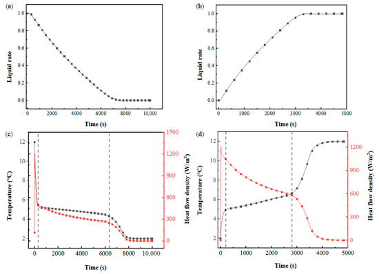 Thermal behavior evolution in a flat-panel phase-change energy storage unit: (a) liquid-phase fraction of PCM the cooling storage process; (b) liquid-phase fraction of PCM during cold release process; (c) PCM temperature and heat flow density during cold storage process; (d) PCM temperature and heat flow density during cold release process.