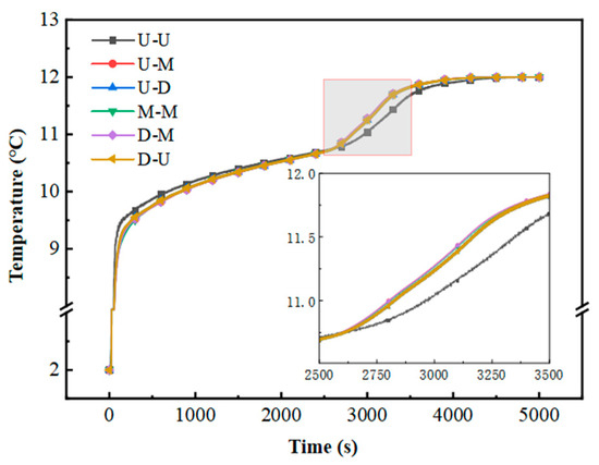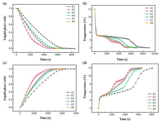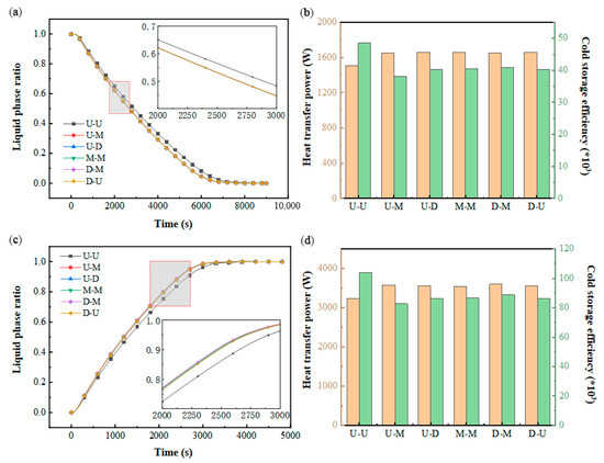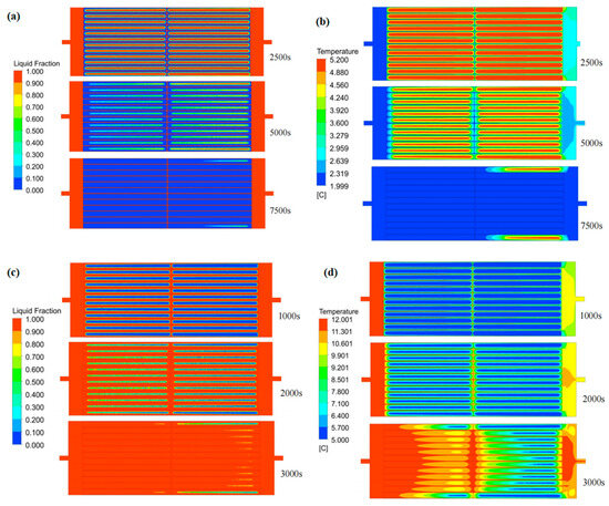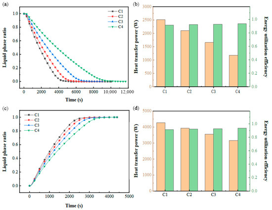 However, flow rates that are too high may also have some negative effects. Excessively fast flow rates during the cooling process may lead to the inhomogeneity of the heat transfer, especially near the solid–liquid interface of the PCM, which may result in unstable heat exchange. Nevertheless, in the vast majority of application scenarios, the increase in the flow rate usually accelerates the phase-change process, especially during the cooling phase, where the melting rate of the PCM increases significantly, which contributes to the overall heat exchange capacity of the system.