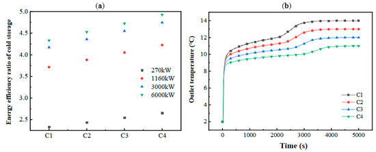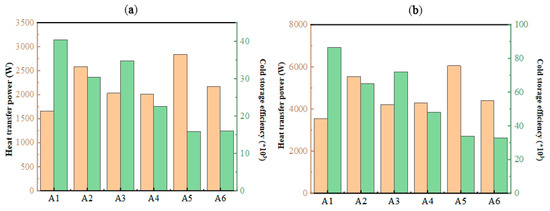 The heat transfer power and the unit phase-change storage/release rate mainly mirror the heat transfer speed of the phase-change energy storage device. Meanwhile, the operating efficiency of the device indicates the alterations in heat transfer and the occurrence of energy loss during the device’s operation. During the cold storage and release processes, there exists energy loss in the heat transfer mode of the device. It is not possible to completely store or release all the energy. Therefore, in order to describe and quantify how energy is utilized during the operation of the device, the energy utilization efficiency η is defined: