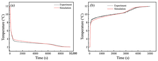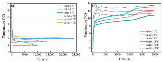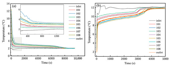 (a) Inlet temperature change during cold storage; (b) inlet temperature change during cold release.