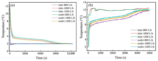 Temperature changes at the outlet under different flow rates: (a) cold storage process; (b) cold release process.