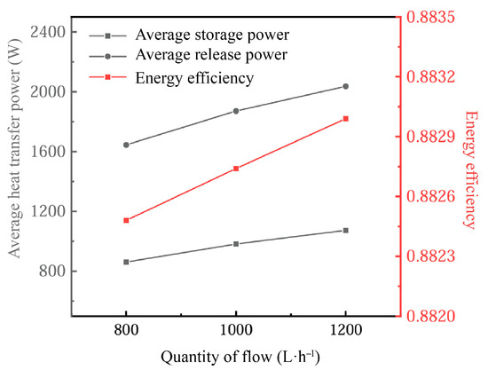As the inlet flow rate increases, the thermal power gain of the system significantly exceeds that of the heat release phase relative to the heat storage phase, due to the higher flow rate promoting more rapid melting and phase-change processes of the PCM. At the same time, energy utilization increases with higher flow rates, but this increase tends to be small in practice, indicating that changes in flow rate have limited energy efficiency gains under general operating conditions.