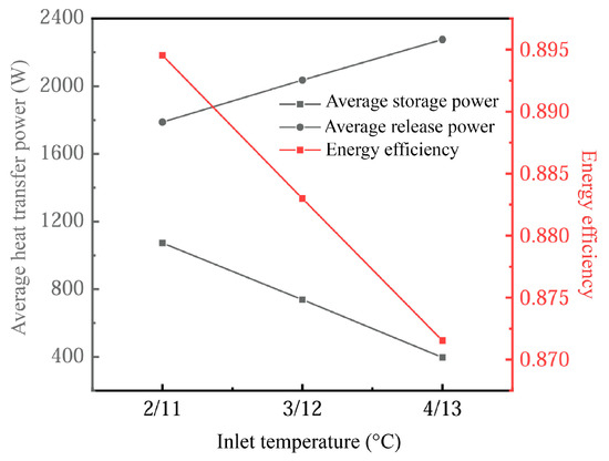 We also found that energy utilization efficiency decreased by approximately 2.5% when the inlet temperature increased from 11–13 °C. This highlights the trade-off between heat input and system efficiency, suggesting that, while exothermic efficiency increases when increasing the inlet temperature, storage efficiency suffers. Therefore, rational control of the inlet temperature range is a key factor in optimizing system heat transfer and energy efficiency.