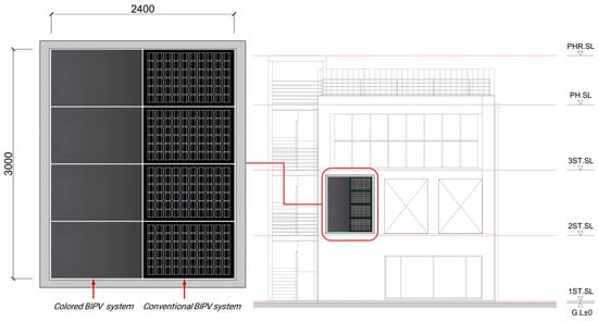 Building-Integrated Photovoltaics (BIPV) integrate Photovoltaics (PV) modules into the building envelope and represent a key technology for achieving Zero Energy Building (ZEB) targets through on-site power generation [1,2,3]. BIPV systems eliminate the need for additional land for PV installation and are increasingly recognized as a high-value technology that can replace conventional building finishes. Nevertheless, their acceptance within the construction industry remains limited due to insufficient design information available to architects, low awareness among practitioners, and aesthetic concerns. To address these issues, colored PV modules in diverse colors have been developed, enabling BIPV systems to provide both power generation and architectural integration. These colored BIPV systems are gradually being adopted in the market, offering aesthetic appeal and harmony with building finishes [4,5]. However, unlike conventional BIPV systems, colored BIPV systems exhibit different performance characteristics in terms of temperature, electrical efficiency, and other factors due to the optical properties of the materials used, such as reflectance and transmittance, and thermal transfer differences based on rear insulation conditions. Therefore, a comprehensive performance evaluation considering these factors is necessary.