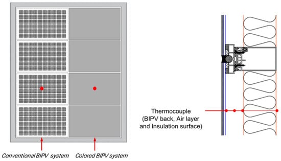 Measurement points for thermocouples on the conventional and colored BIPV systems. In the left figure, the red points indicate the locations of the temperature sensors installed at the back of the BIPV systems. In the right figure, the red points indicate the positions of the thermocouples installed at the BIPV back, air layer, and insulation surface.