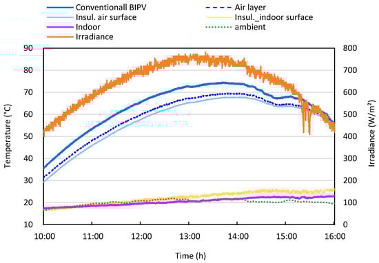 Figure 8 and Figure 9 illustrate the temperature characteristics of the gray and conventional BIPV systems installed on the building façade over the course of the representative measurement day. These figures focus on the temporal variation in temperature distributions across different layers of the BIPV assembly under real outdoor conditions. During the measurement period, the ambient conditions exhibited irradiance ranging from approximately 400 W/m2 to 780 W/m2 and outdoor temperatures fluctuated between 18 °C and 21 °C. The rear temperature of the gray BIPV modules ranged from approximately 33 °C to 68 °C, while the rear temperature of the conventional BIPV modules ranged from about 35 °C to 75 °C. The rear temperature of the gray BIPV modules was up to 7 °C lower than that of the conventional BIPV modules. The temperature in the air layer within the BIPV system was measured to be 5–6 °C lower compared to each module’s rear temperature. The temperature difference in the air layer for each BIPV system showed a similar pattern to the temperature difference in the module. The temperature of each component in the BIPV system decreased in the following order: BIPV module rear, air layer, insulation surface facing the air layer, and interior insulation surface. That is, the temperature was lower towards the interior.