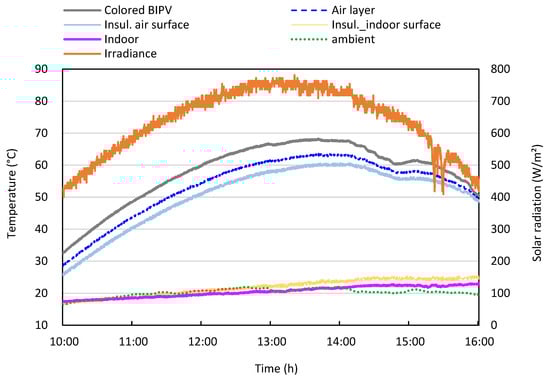 All experimental data presented in Figure 8, Figure 9, Figure 10, Figure 11, Figure 12, Figure 13, Figure 14 and Figure 15 were obtained on 31 October 2021, under clear-sky conditions. The selected measurement day represents a typical autumn day with moderate irradiance levels and stable outdoor temperatures, which allows for a consistent comparative evaluation between the gray and conventional BIPV systems, and all subsequent analyses are based on this dataset.