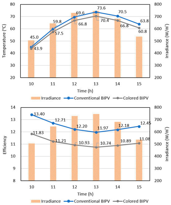 Hourly temperature and electrical efficiency of conventional and gray-colored BIPV systems under identical outdoor conditions.