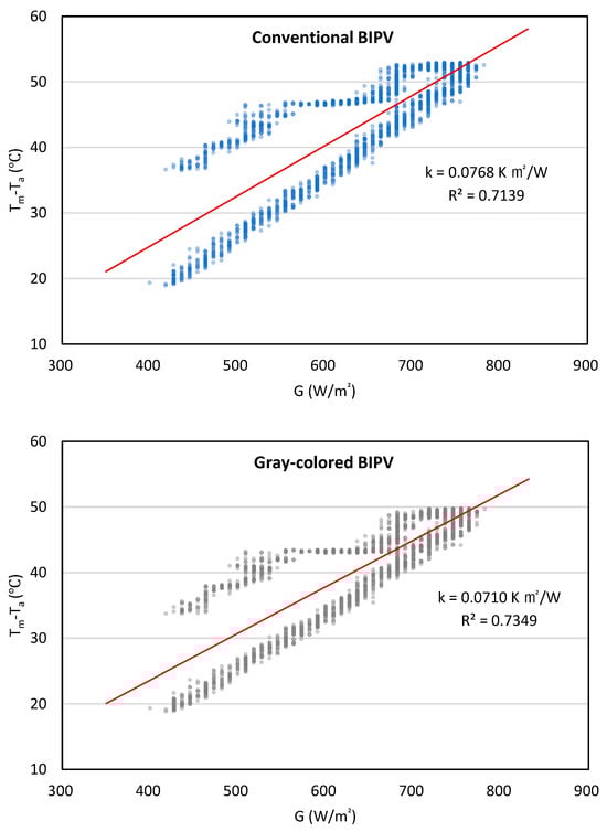 Scatter plot of module-to-ambient temperature difference (ΔTm−a) versus global POA irradiance (G), with linear regression (red line) for the conventional and gray-colored BIPV. The blue and gray points indicate the measured data for the conventional and gray-colored BIPV systems, respectively.