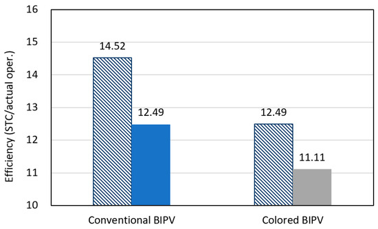 Comparison of efficiency under STC and actual operation conditions of conventional and colored BIPV system. The blue and gray hatched pillars indicate the efficiency of each BIPV module under STC, and the solid pillars indicate the efficiency under actual operation conditions.