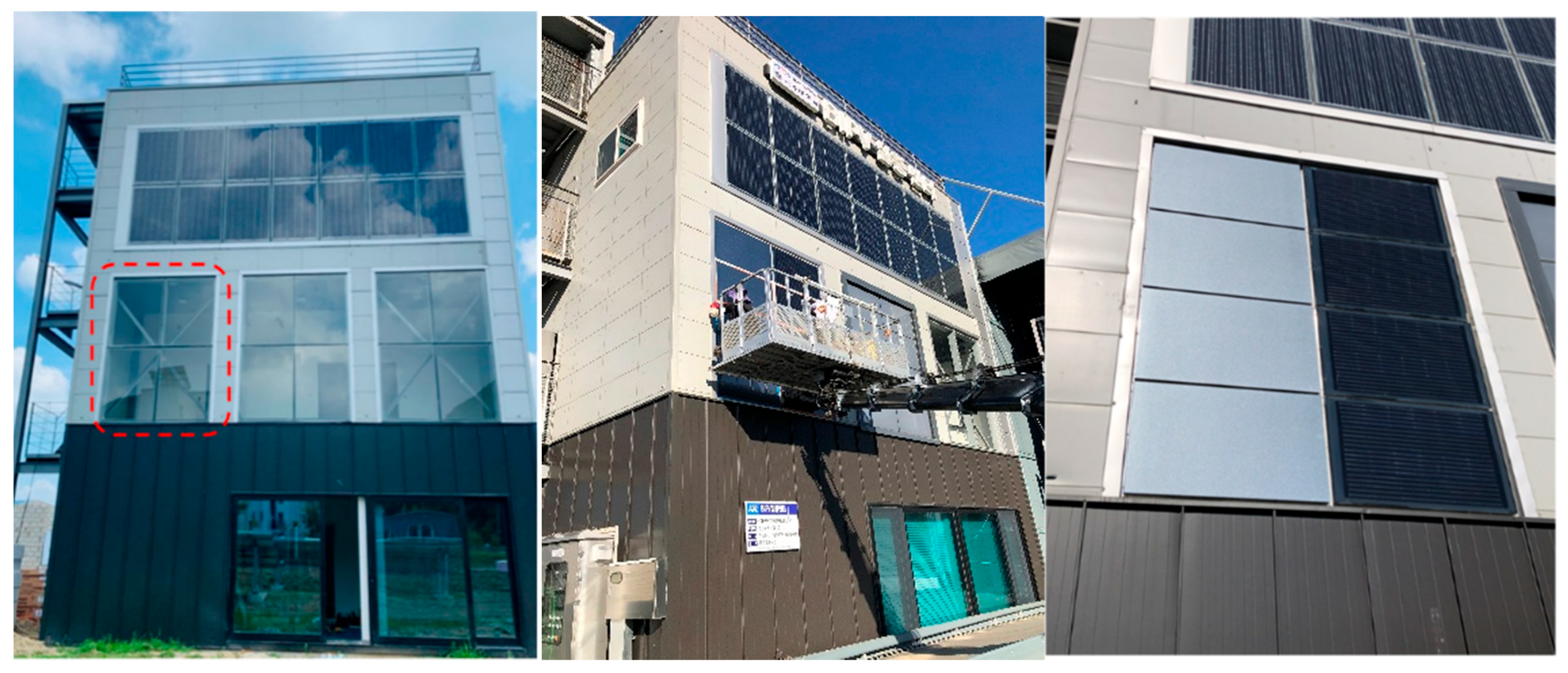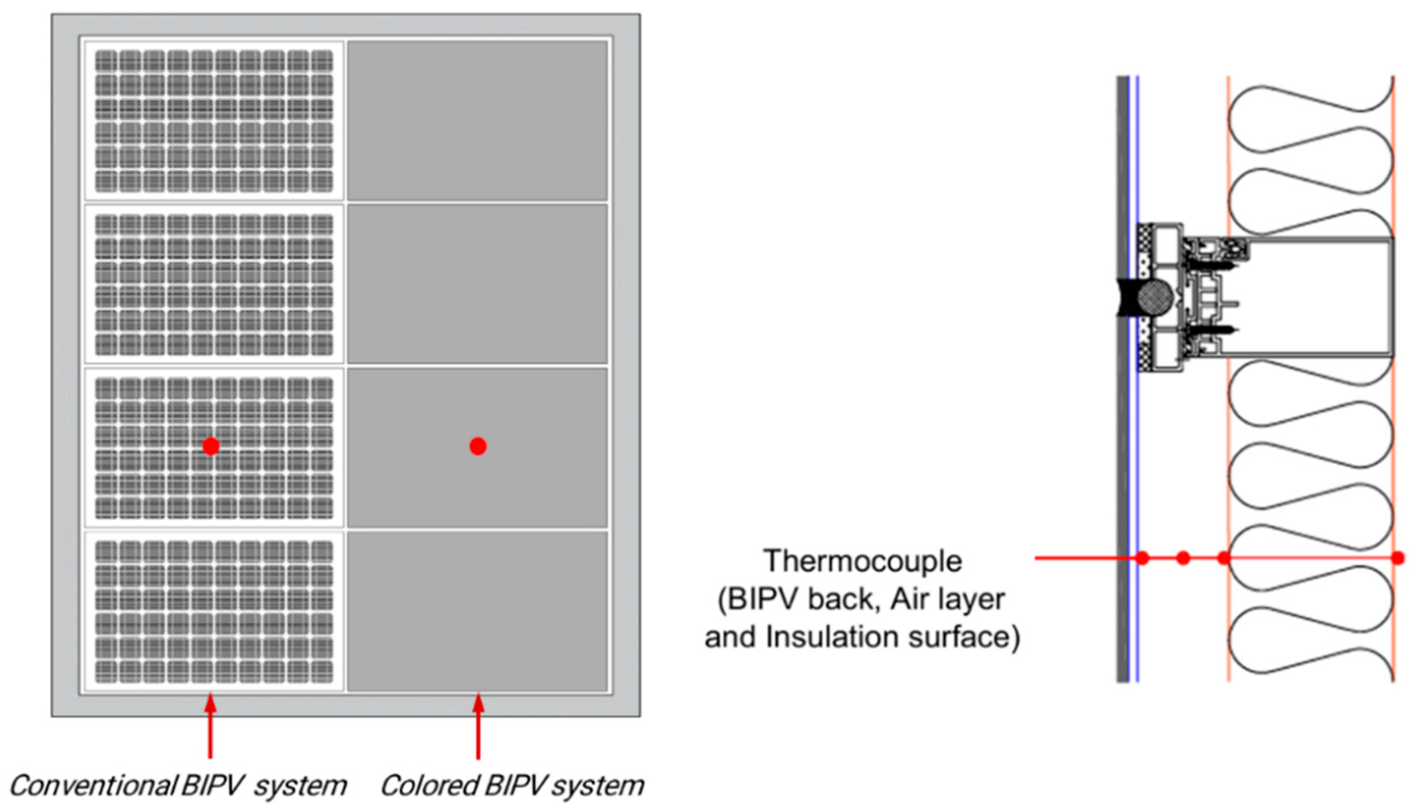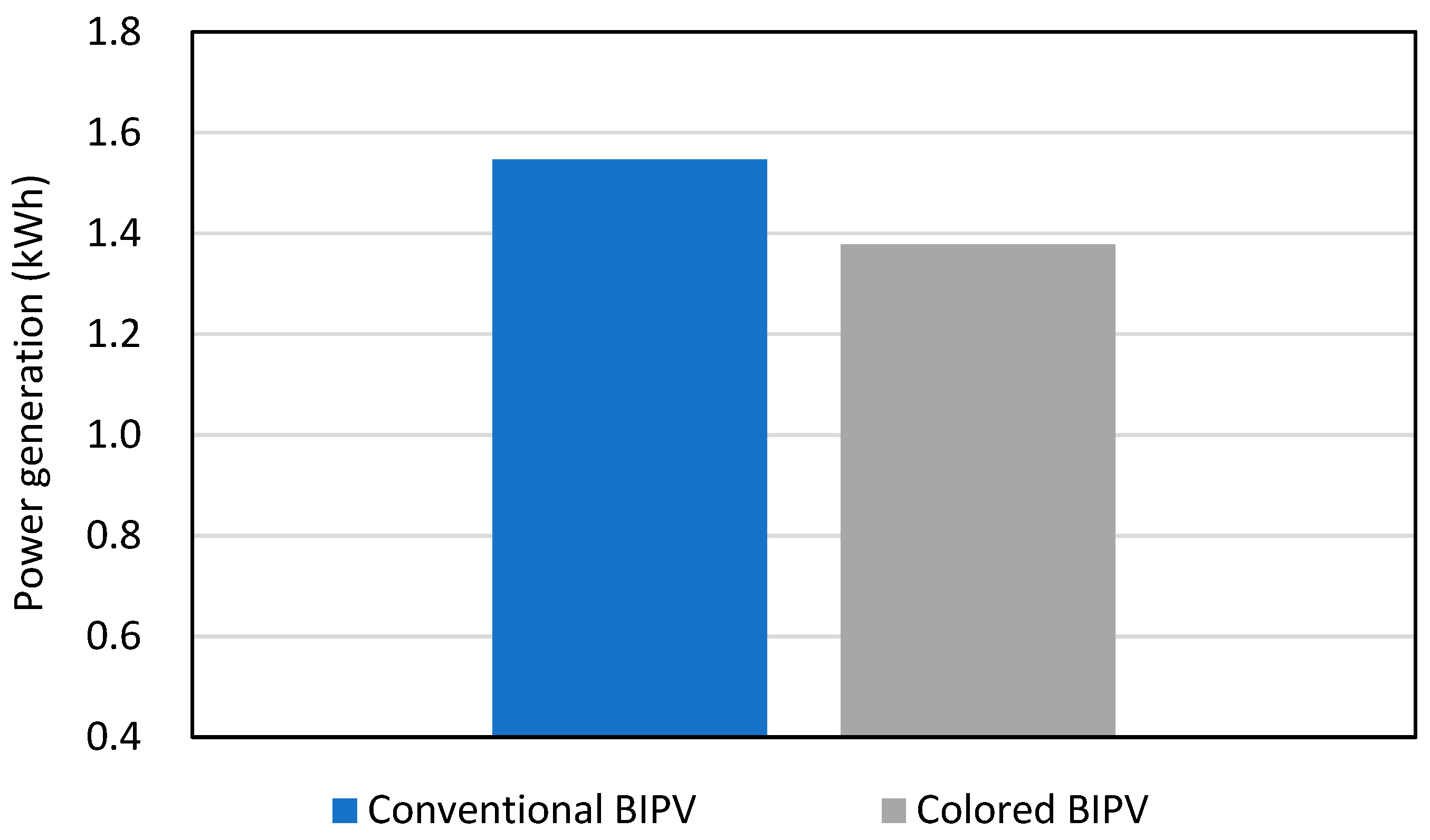 6]. Nicolas et al. investigated a colored BIPV system installed on the Kohlesilo building in Basel, Switzerland, employing crystalline silicon glass-to-glass modules in five colors (black, green, blue, gray, and gold). Relative to black modules, gray and gold modules yielded approximately 76% of the energy output, while green and blue modules reached about 84% [
