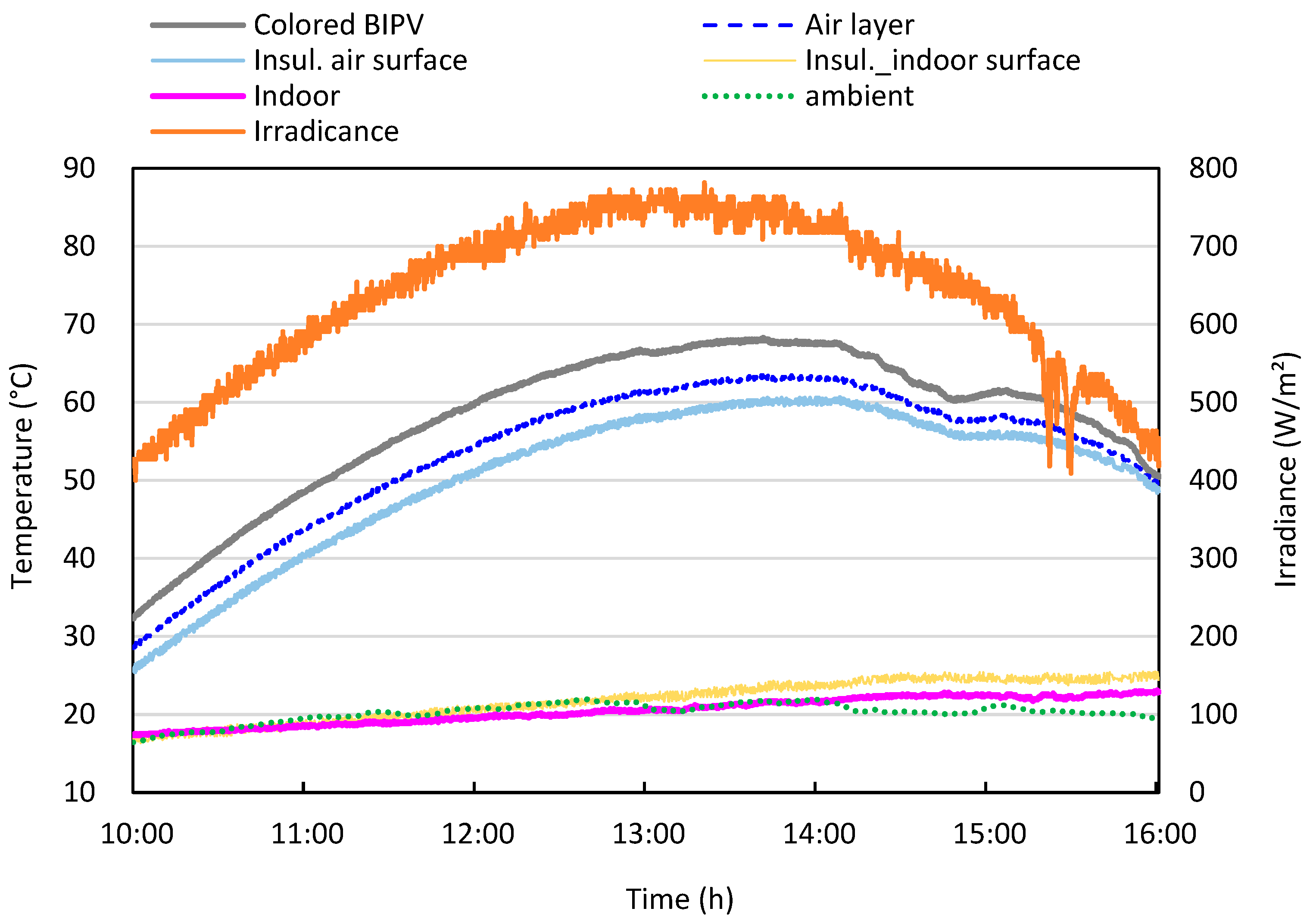 2 and outdoor temperatures fluctuated between 18 °C and 21 °C. The rear temperature of the gray BIPV modules ranged from approximately 33 °C to 68 °C, while the rear temperature of the conventional BIPV modules ranged from about 35 °C to 75 °C. The rear temperature of the gray BIPV modules was up to 7 °C lower than that of the conventional BIPV modules. The temperature in the air layer within the BIPV system was measured to be 5–6 °C lower compared to each module’s rear temperature. The temperature difference in the air layer for each BIPV system showed a similar pattern to the temperature difference in the module. The temperature of each component in the BIPV system decreased in the following order: BIPV module rear, air layer, insulation surface facing the air layer, and interior insulation surface. That is, the temperature was lower towards the interior.