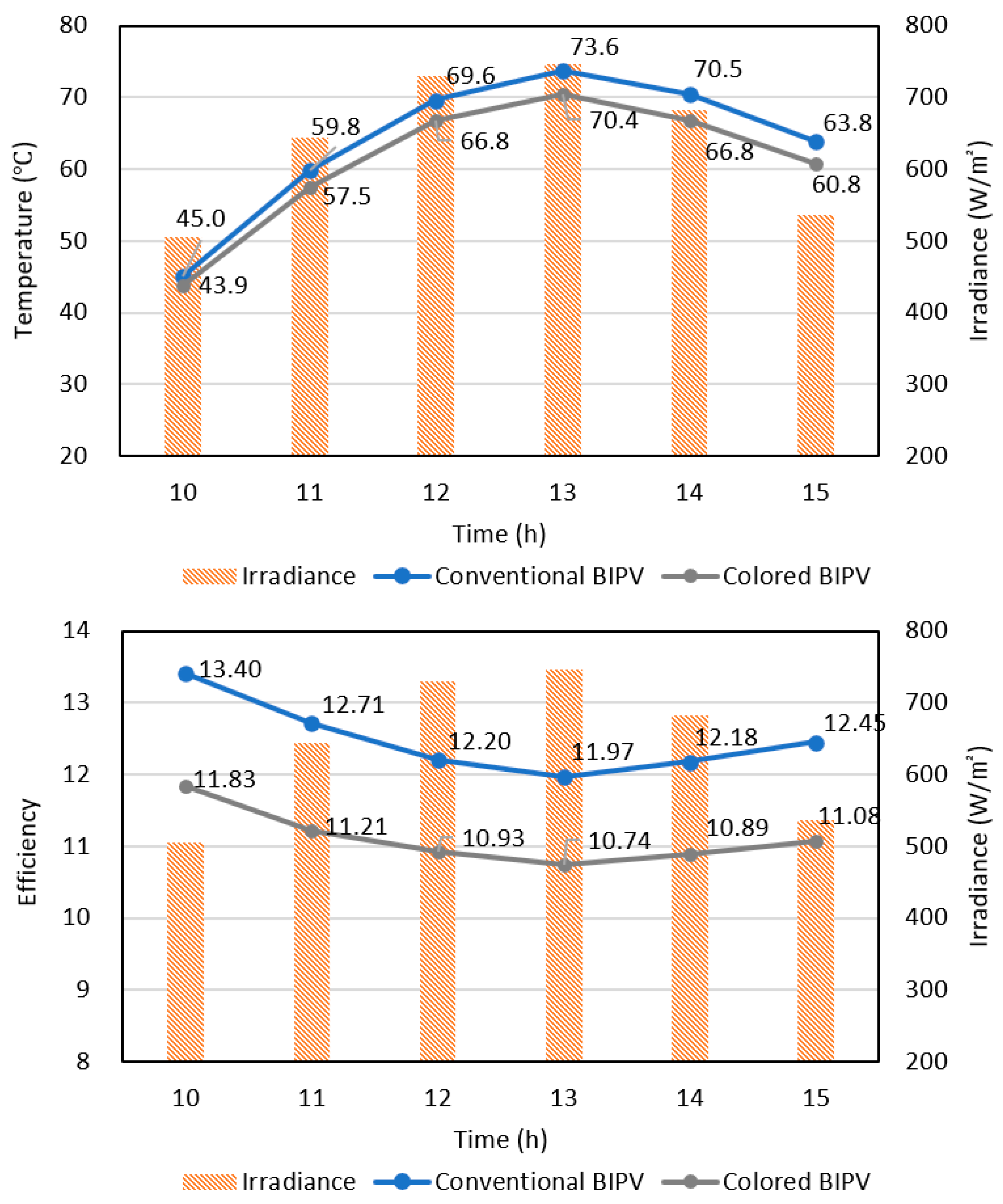 Overall, the results highlight a trade-off between thermal and electrical performance: conventional BIPV modules exhibit superior electrical efficiency but are more vulnerable to high operating temperatures, whereas colored BIPV modules demonstrate enhanced thermal stability at the expense of conversion efficiency. These findings emphasize the need for advanced coloring technologies and optimized thermal management strategies to balance aesthetics, temperature regulation, and power generation in BIPV applications.