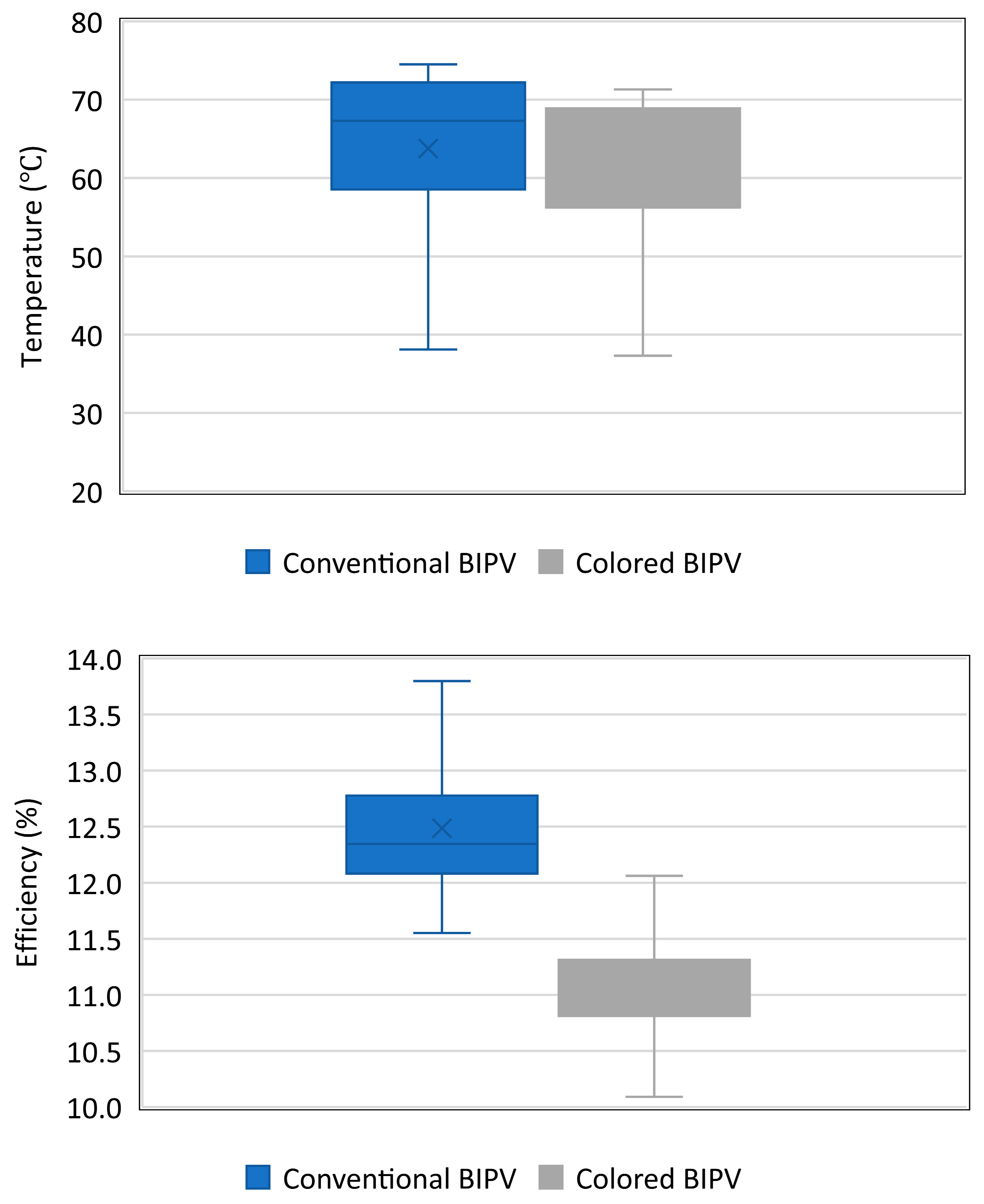 Figure 12 illustrates the statistical distribution of temperature and electrical efficiency for conventional and colored BIPV modules. The rear-surface temperature of the conventional BIPV modules exhibited a median value of approximately 64 °C, with a range between 38 °C and 76 °C, while the colored BIPV modules showed a lower median of around 61 °C and a broader variation from 37 °C to 71 °C. These results indicate that the colored BIPV modules consistently operate at slightly lower temperatures, suggesting improved heat dissipation characteristics compared to conventional BIPV modules.
