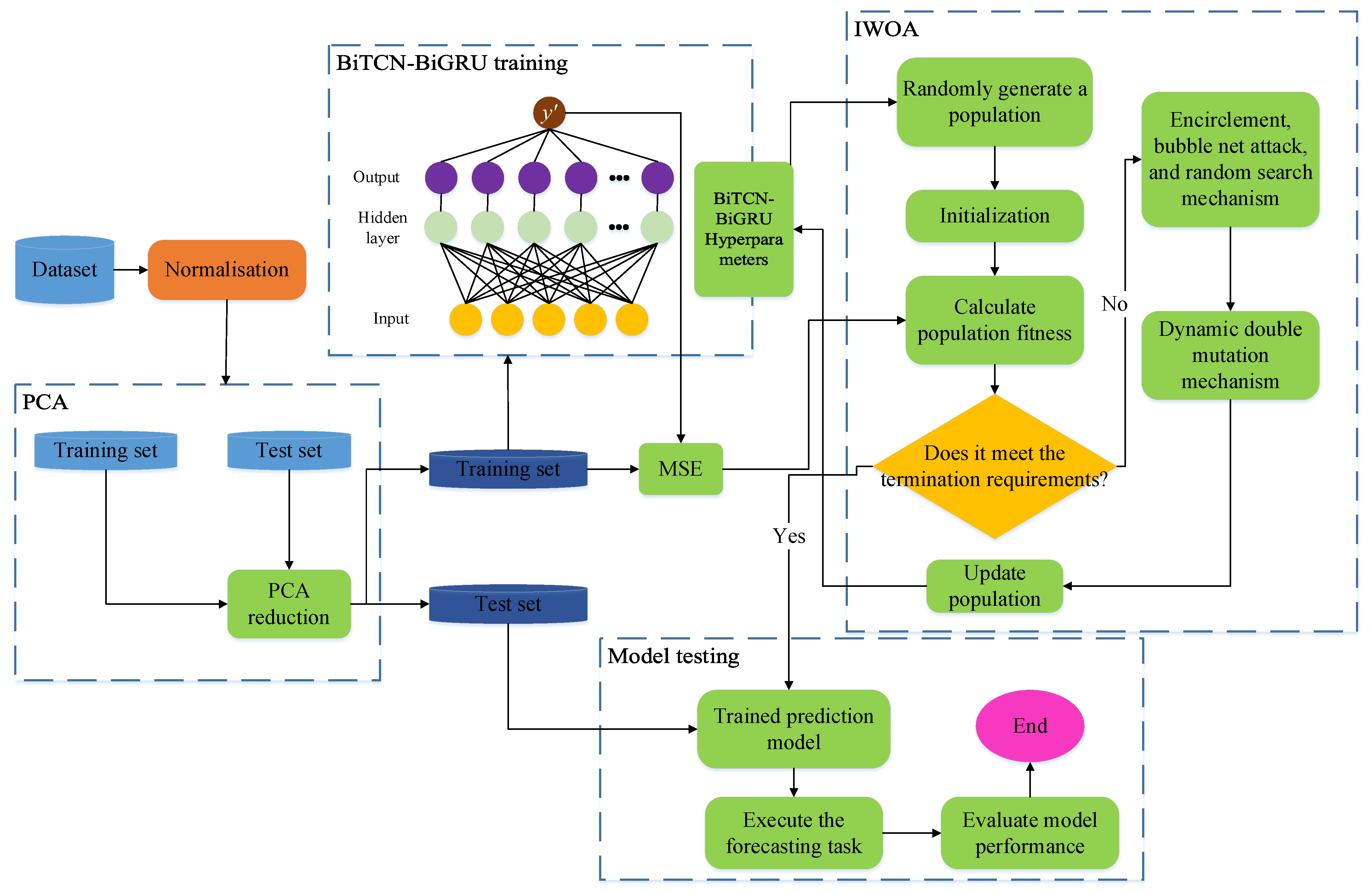 - An improved whale optimization algorithm is designed to tune hyperparameters of BiTCN and BiGRU, avoiding manual trial-and-error and improving model generalization.
