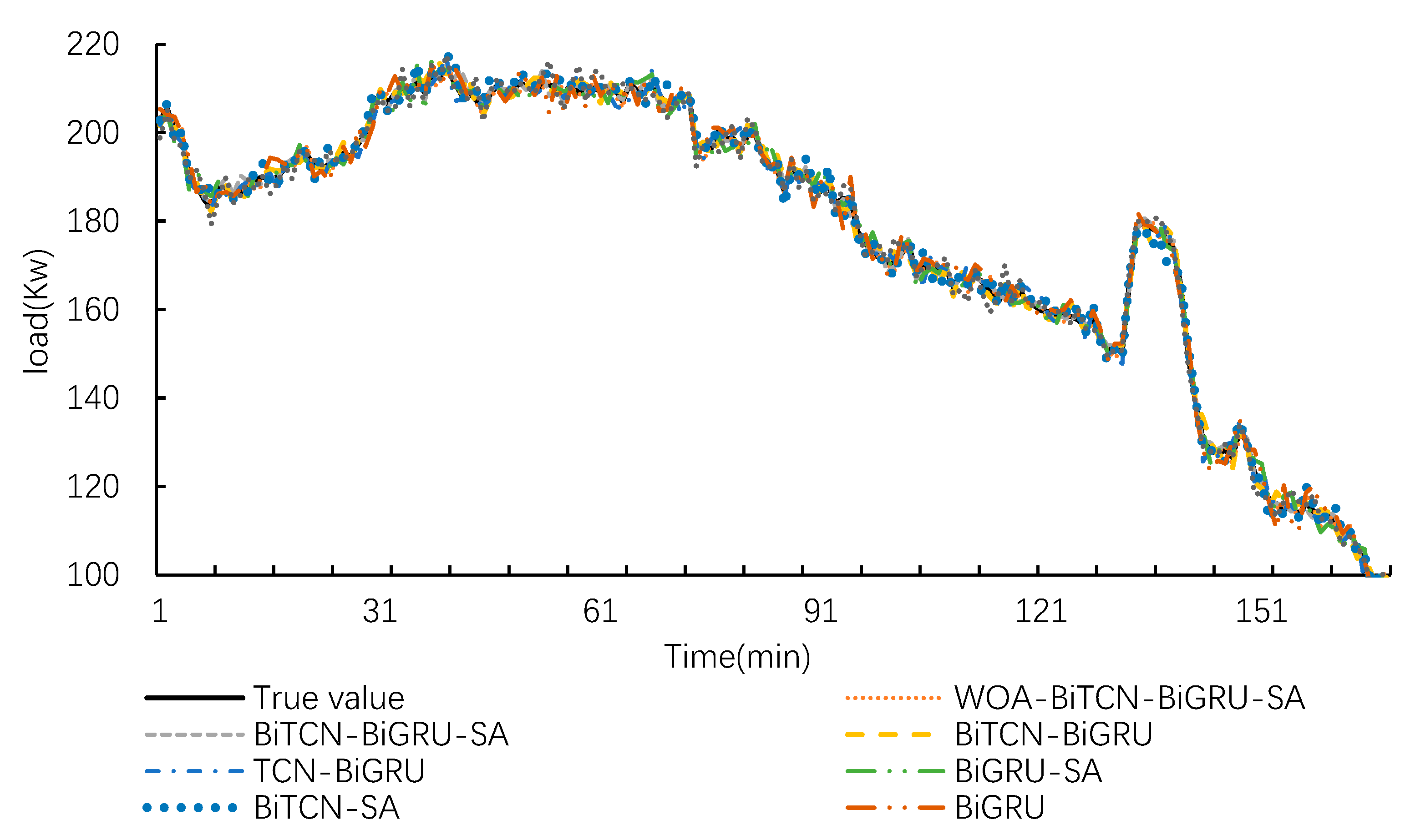 - The hybrid BiTCN-BiGRU architecture demonstrated superior capability in extracting complex temporal features. Compared to the standard TCN-BiGRU model, the BiTCN-BiGRU model reduced the RMSE by 1.1647 kW. This confirms that the bidirectional structure of BiTCN can more effectively capture multi-scale temporal dependencies from both past and future contexts, leading to a more comprehensive feature representation than a unidirectional TCN.