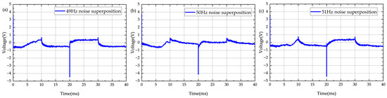 Signal with superimposed power frequency noise. (a) 49 Hz power frequency noise superimposed signal; (b) 50 Hz power frequency noise superimposed signal; (c) 51 Hz power frequency noise superimposed signal.