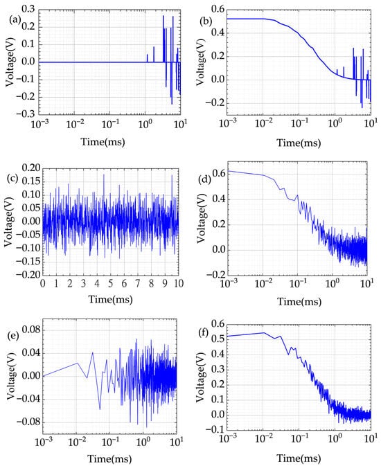 By combining the electromagnetic data obtained from the forward model with the generated random signals, the noise superposition effect shown in Figure 6 is obtained. Among them, (a) shows that the spike noise manifests as sudden high-amplitude abnormal points in the time series, and (b) demonstrates that the spike noise presents local mutation characteristics in the time domain of the electromagnetic signal; the Gaussian noise shown in (c) has statistical characteristics of zero mean and constant variance, and (d) indicates that this noise mainly causes significant interference to the late period of the electromagnetic signal; (e) reflects the influence of the time-series fluctuation of the amplitude of the sampling points of the instrument background noise, and (f) shows that this influence is across the entire time domain and has a similar variation pattern to the electromagnetic signal.