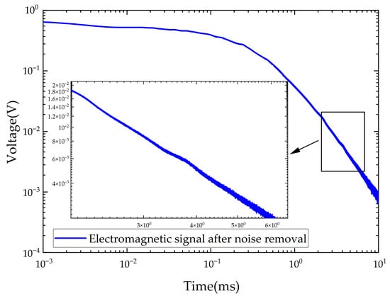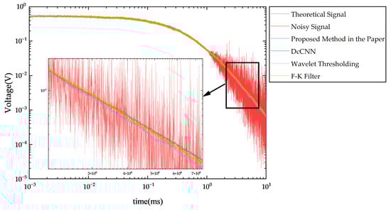 It can be seen from Figure 12 that after processing the noise collected from the substation according to the electromagnetic noise suppression strategy proposed in this paper, the measurement results consistent with the ideal signal waveform are obtained. The waveform has high prediction accuracy in all stages and performs extremely well in the prediction of late signals, which are more concerned in PEC inversion. After denoising the experimental data using the method proposed in this paper, the signal-to-noise ratio (SNR) of the signal before and after processing is calculated. The results show that after processing, the average signal-to-noise ratio of the signal increases from 20 dB to 25 dB, significantly increased by 5 dB, which proves the excellent noise reduction performance of the method proposed in this paper in the real substation environment.