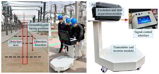 In this paper, signal collection is performed on a substation in a certain region of China using a PEC device. The collection method is point collection, with a total of 50 measurement points set up. That is, measurements are taken every 0.5 m, and each measurement point should collect data for at least 100 cycles. The on-site measurement diagram is shown in Figure 8a. The PEC detection equipment used in this study is a self-developed substation grounding grid PEC detector. The system consists of a transmitter, receiver, control, and auxiliary modules. The transmitter module utilizes a 30-turn copper coil with a radius of 0.4 m, a maximum transmit current of approximately 20 A, and a 25 Hz double-pulse square wave excitation waveform (25% duty cycle) with an off-time of less than 20 μs. The receiver module consists of a 300-turn copper coil with a radius of 0.1 m, a sampling rate of 1 MHz, and a 16-bit A/D converter. The control module is based on an STM32H743 microcontroller from Chinese Dot Atoms, which implements timing synchronization between transmit and receive, as well as data caching, with a storage capacity of 8 GB. A Lenovo ThinkPad laptop was used as an auxiliary device for data storage and preliminary verification during the field experiments. The schematic diagram of the detection device is in Figure 8b.