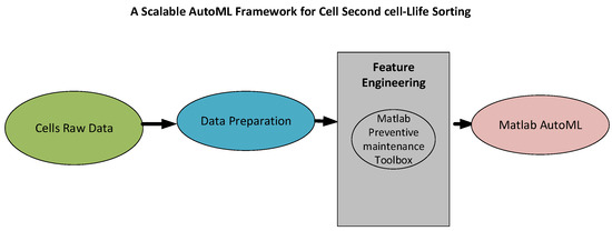 As introduced in Section 1, this study presents a scalable AutoML-based framework for classifying Li-ion cell chemistries using long-term cycling data. Figure 1 visualises the end-to-end pipeline, beginning with raw data ingestion and segmentation, followed by multi-tier feature engineering using MATLAB’s PMT. Features are then processed and passed to an AutoML module for automated model selection, hyperparameter tuning, and evaluation. Final classification results are validated using confusion matrix analysis.