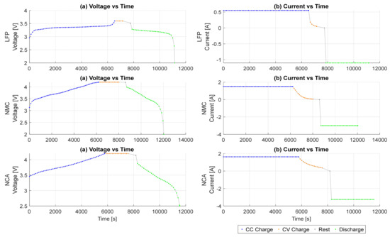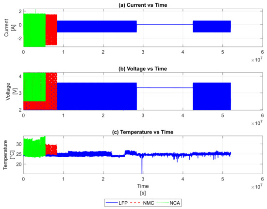 Time-series profiles of current, voltage, and temperature for LFP, NMC, and NCA chemistries under identical cycling conditions (25 °C, 0–100% DoD, 0.5 C–1 C charge/discharge rates).