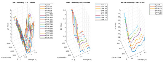 The 3D DV curves shown in Figure 6 illustrate voltage behaviour across selected cycles for LFP, NMC, and NCA chemistries. As summarised in Table 4, LFP typically exhibits a single sharp peak near 3.4 V, NMC displays broader overlapping transitions around 3.7–4.1 V, and NCA reveals sharper transitions with steeper peak slopes. These distinctions help differentiate chemistries with overlapping voltage ranges by exposing unique electrochemical signatures.