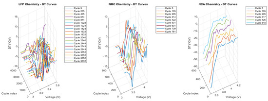 High-resolution diagnostic curves (IC, DV, and DT) are presented across selected cycles for three target chemistries: LFP, NMC, and NCA. These curves reveal degradation patterns and electrochemical and thermal signatures, which enhance model interpretability and classification accuracy.
