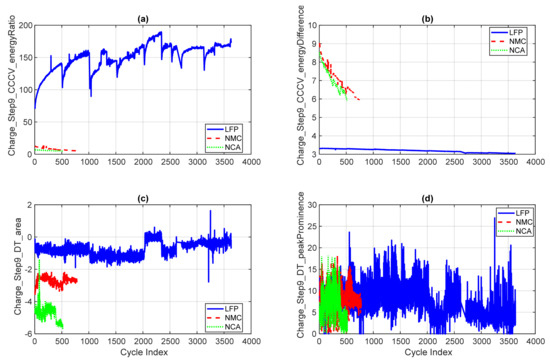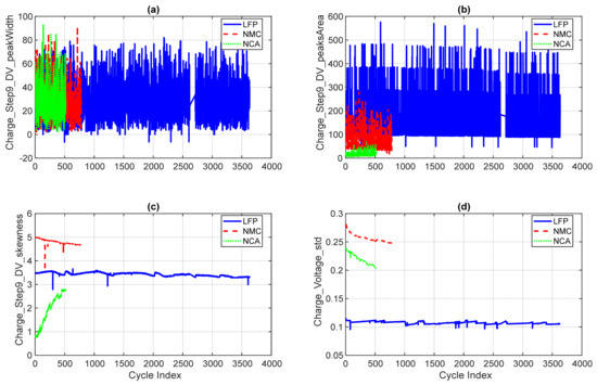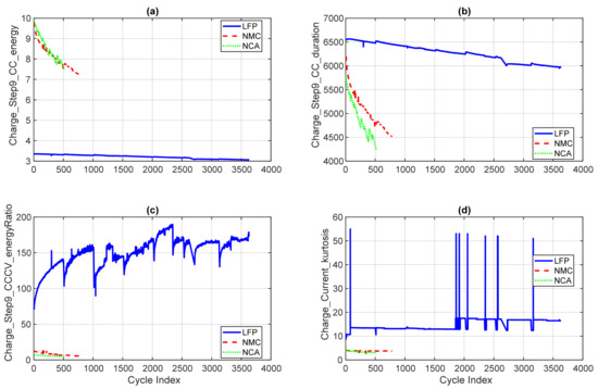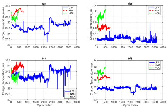This grouping aligns with the structure used in Section 4.2, where segment-level statistics and cycle-level aggregates are treated as a unified category to improve clarity and interpretability. Each group captures chemistry-specific behaviour across electrochemical, thermal, and operational dimensions. For clarity and traceability, representative features from each group are visualised in Figure 9, Figure 10, Figure 11 and Figure 12, with subplot labels (a)–(d) indicating the specific feature plotted. These visual references help illustrate the temporal evolution and chemistry-specific trends of selected features across cycles. The full list of 75 engineered features used in unsupervised analysis (e.g., correlation and PCA) is provided below, organised by diagnostic relevance and extraction domain.