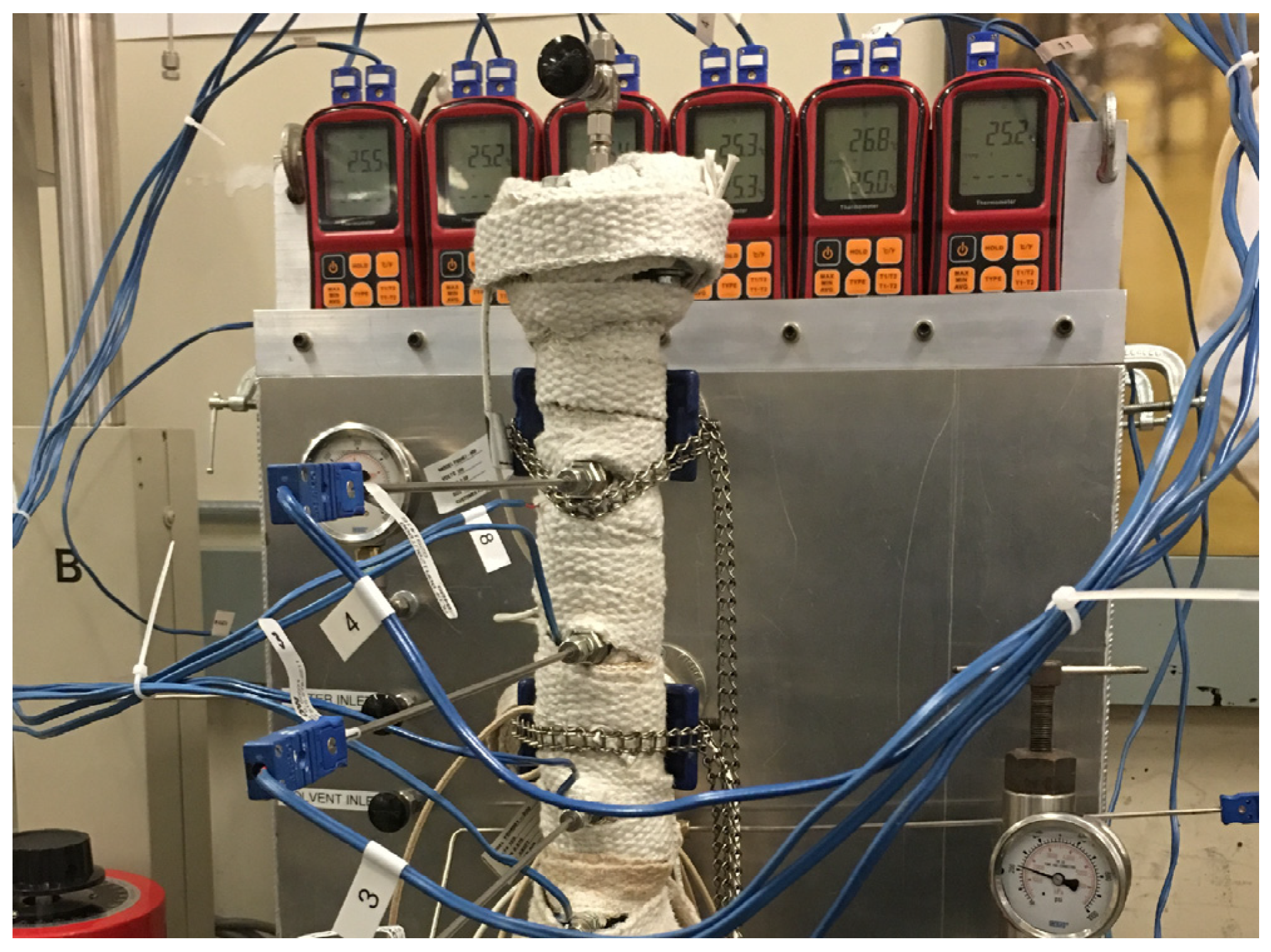 Once porosity and permeability were measured, a first insulation layer was wrapped and subsequently outer thermocouples to each zone were installed to track the inner increase in temperature through four independent heating tapes ensuring the only source of heat remained the injected steam.