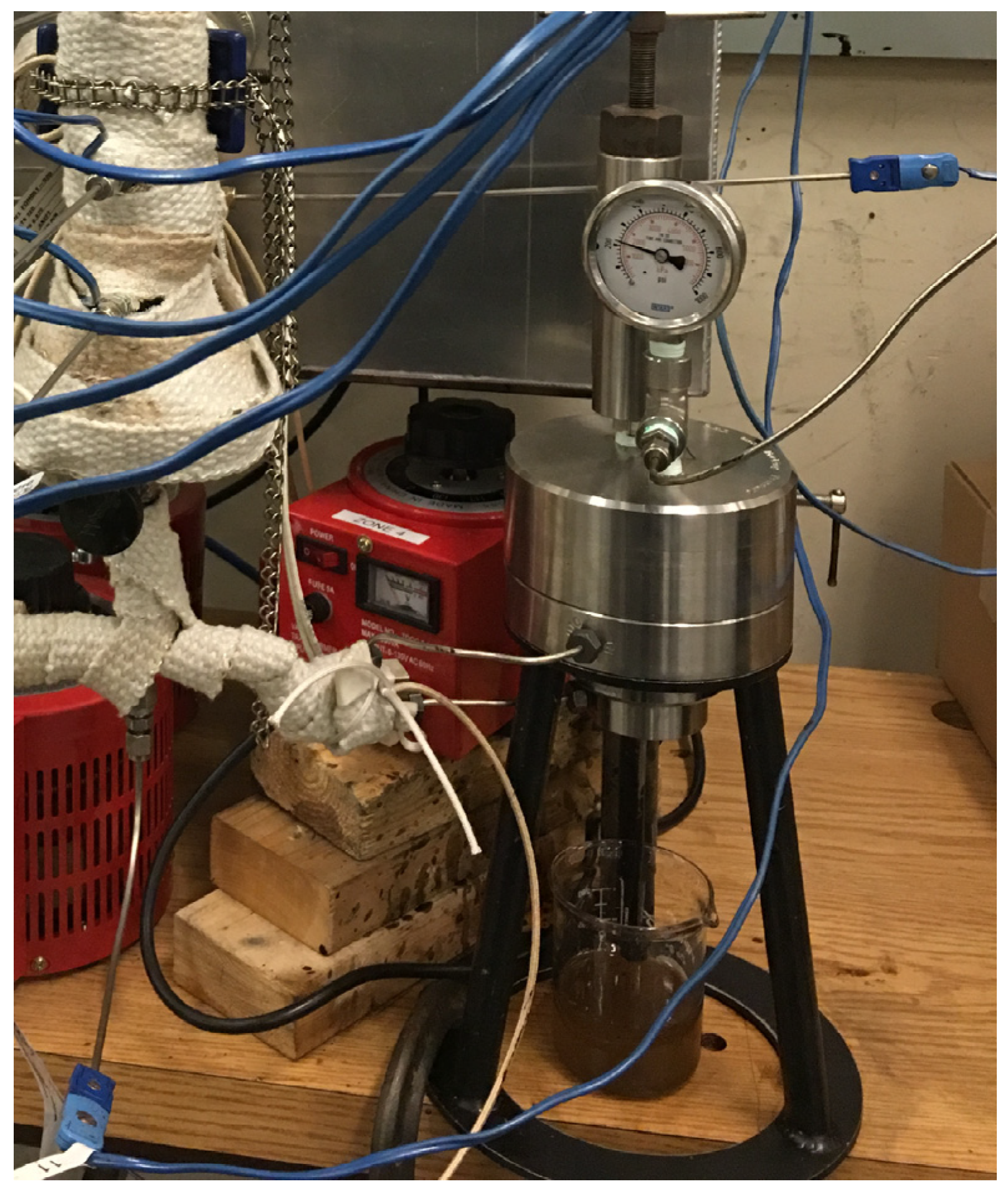 A production line extending from the outlet of the sand pack to a Back Pressure Regulator (BPR) maintained at 230 psi (1.585 MPa) was equipped with heat tracing and externally heated to prevent bitumen cooling and potential plugging along the flow path (