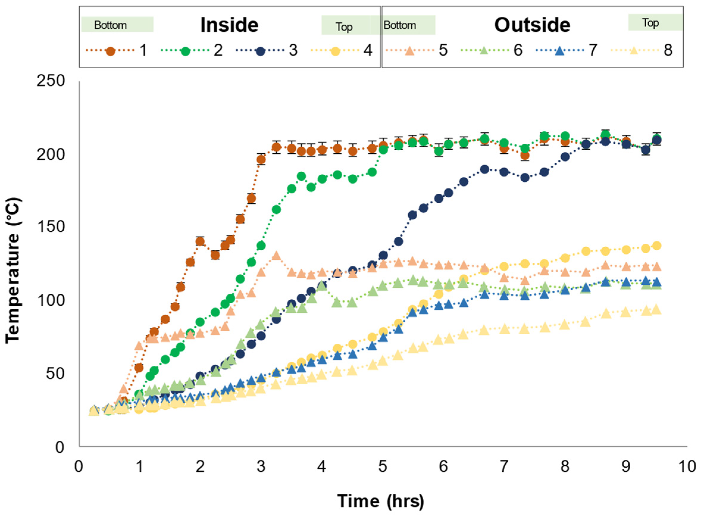 Temperature monitoring employed thermocouples with an uncertainty of ±2.0 °C across the operating range, and data were recorded with a resolution of ±0.1 °C. This measurement variability is reflected in the temperature profiles, particularly in zone 1. Data regarding temperature and pressure were recorded manually over intervals of approximately five minutes. As a result, temporal continuity was approximated to interpolate between readings.