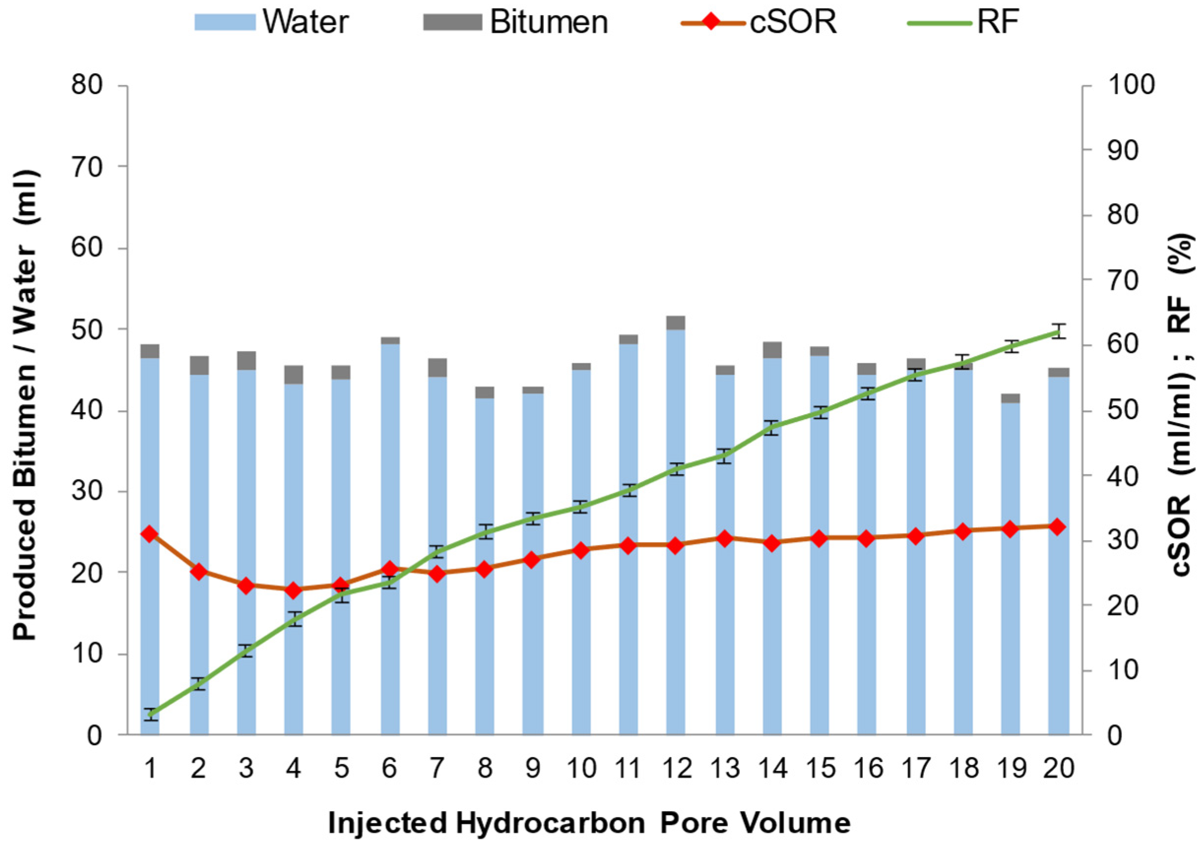 Oil production proceeded at a consistent rate throughout the duration of the test. Analysis of the collected samples enabled the construction of a recovery factor (RF)—defined as the volume of bitumen recovered normalised by the hydrocarbon pore volume (HCPV)—plotted against the cumulative steam injected to evaluate process performance, as illustrated (