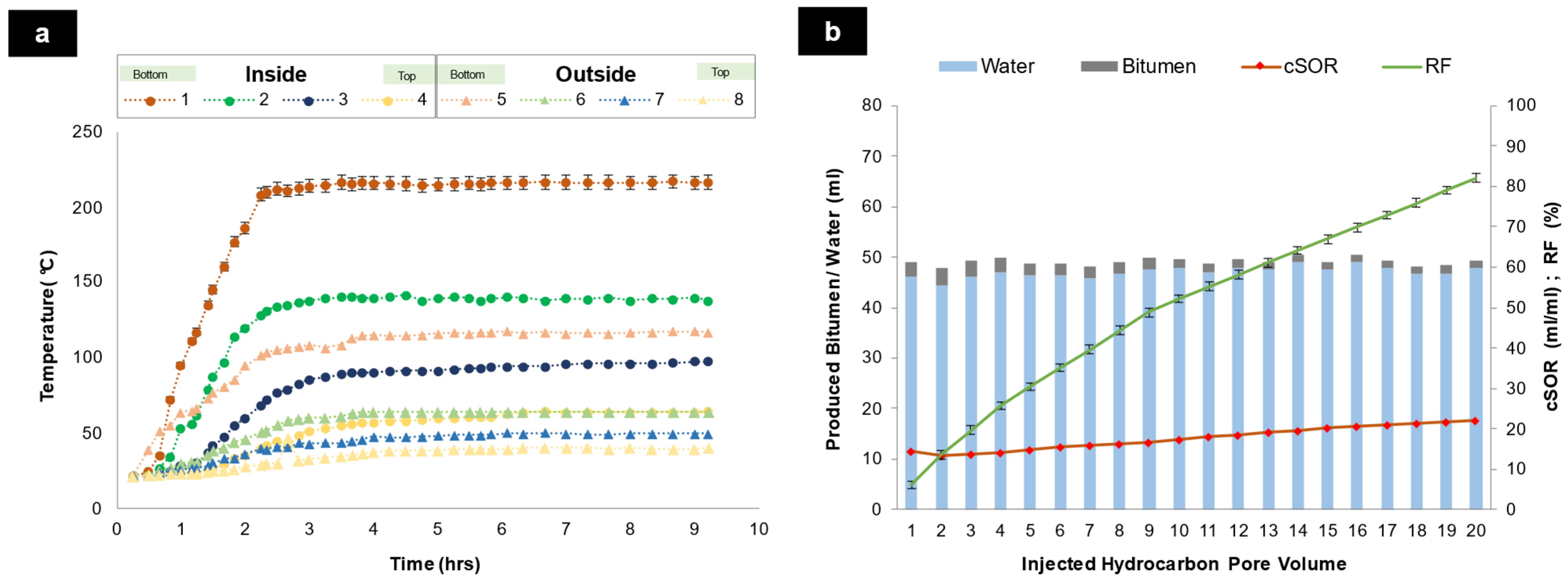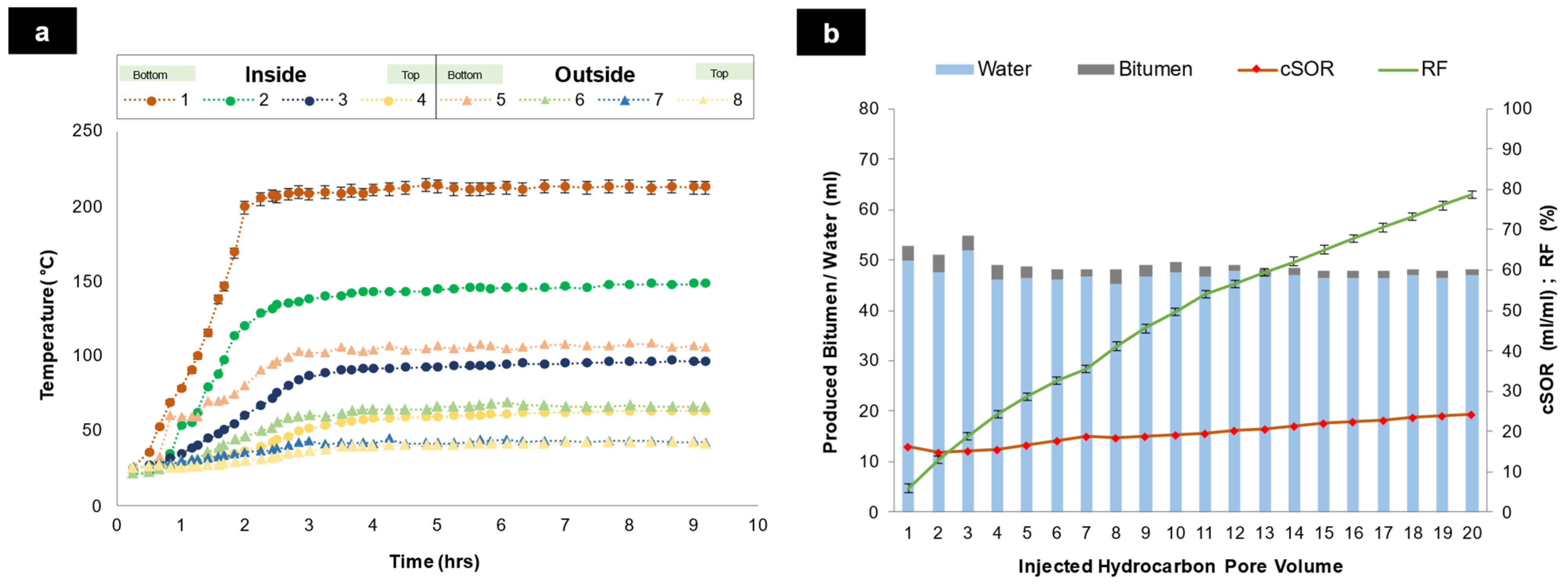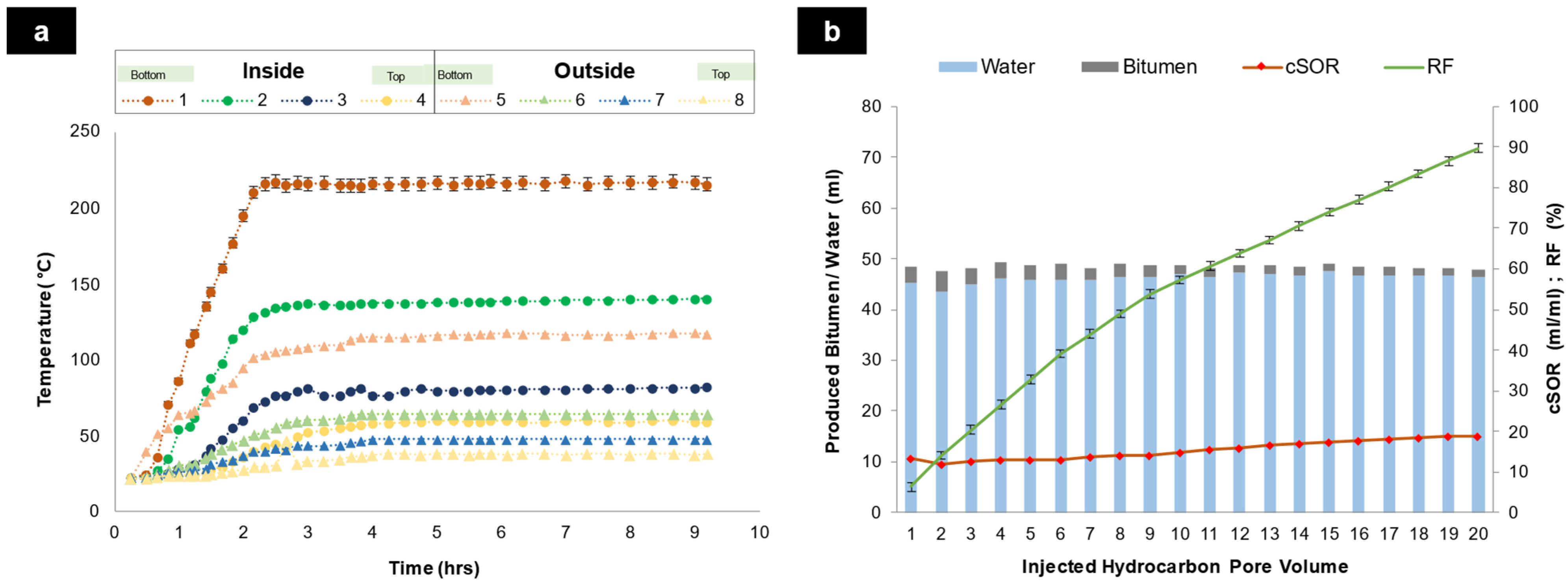 In this phase of this study, three high-pressure/high-temperature (HP/HT) SA-SAGD experiments were performed using a partially scaled linear physical model. Throughout each test, temperature, flow rate, and pressure were continuously monitored, while produced fluid samples were collected and analysed. In addition, post-test analysis of the porous matrix was conducted to evaluate process efficiency. The performance of each experiment was assessed based on key metrics, including vapour chamber growth rate, oil and water production rates, steam–oil ratio (SOR), and the residual oil saturation within the sand pack.