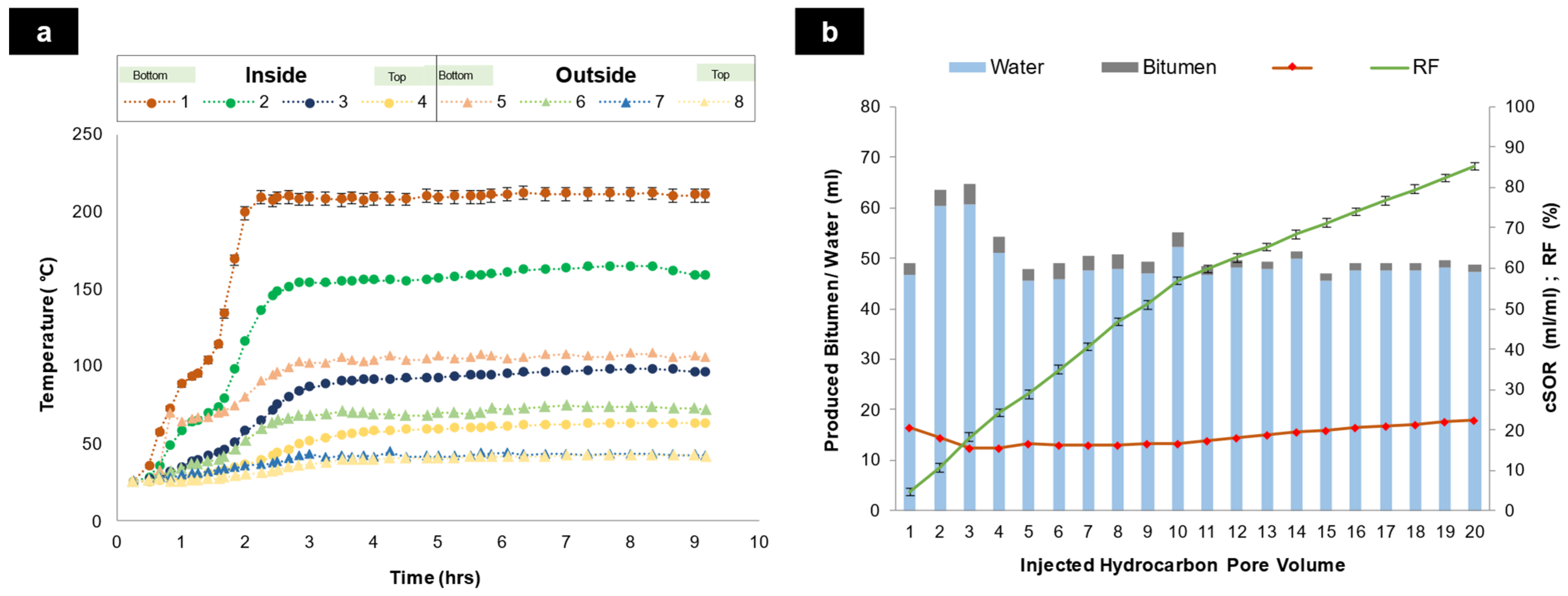 A consistent steam chamber growth was observed throughout the test, although the temperature in zone four remained below 207 °C (steam injection temperature), unlike in the other three zones (