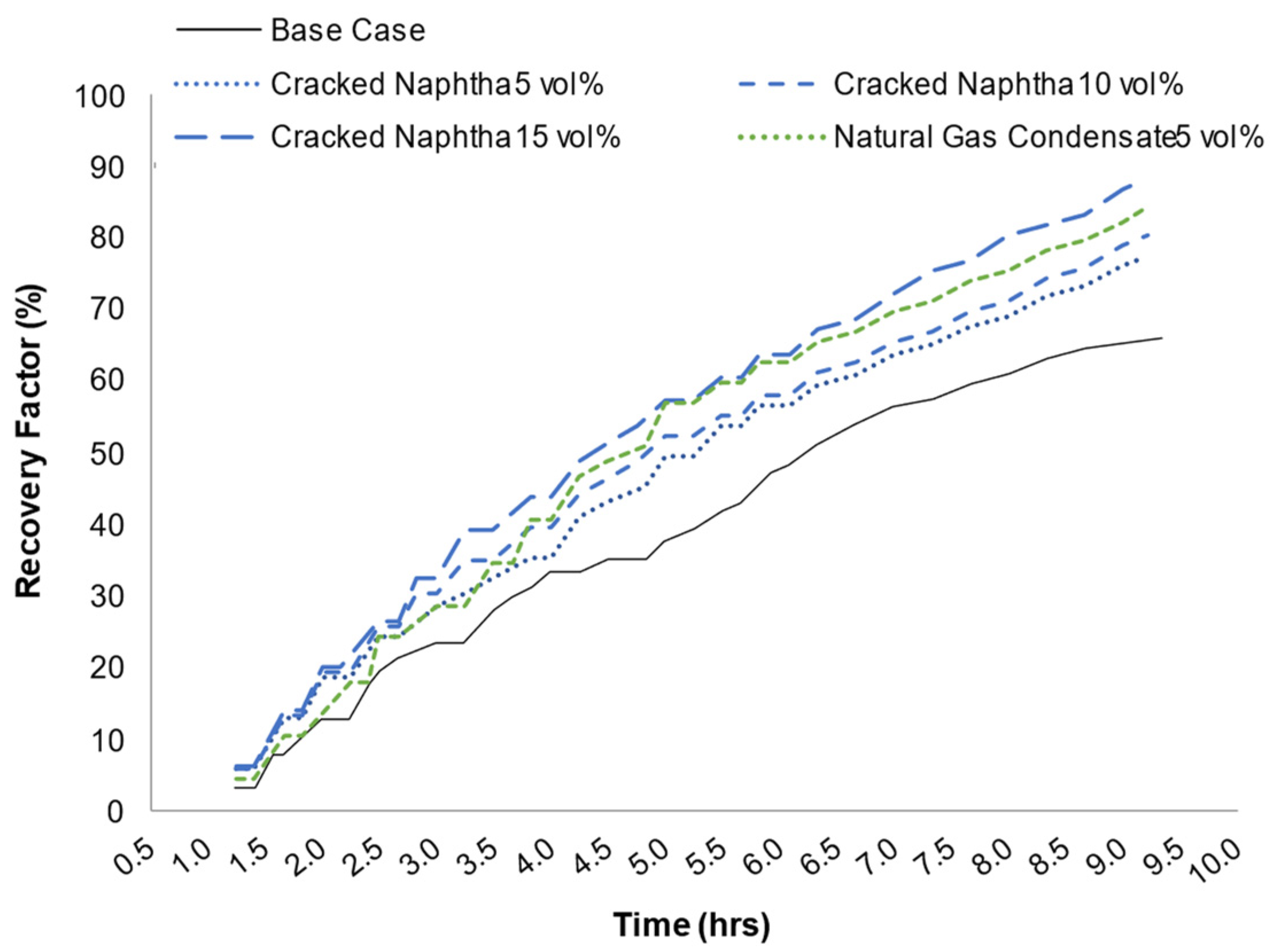 Figure 11). The addition of cracked naphtha or gas condensate in conjunction with steam enhances the initial phase of the SAGD process by significantly lowering the viscosity of bitumen in the region between the well pair, thereby expediting the preheating period and accelerating steam chamber development. The final recovery factor was 23.3% OOIP higher with coinjection of the natural gas condensate, which is much better than cracked naphtha at this concentration.